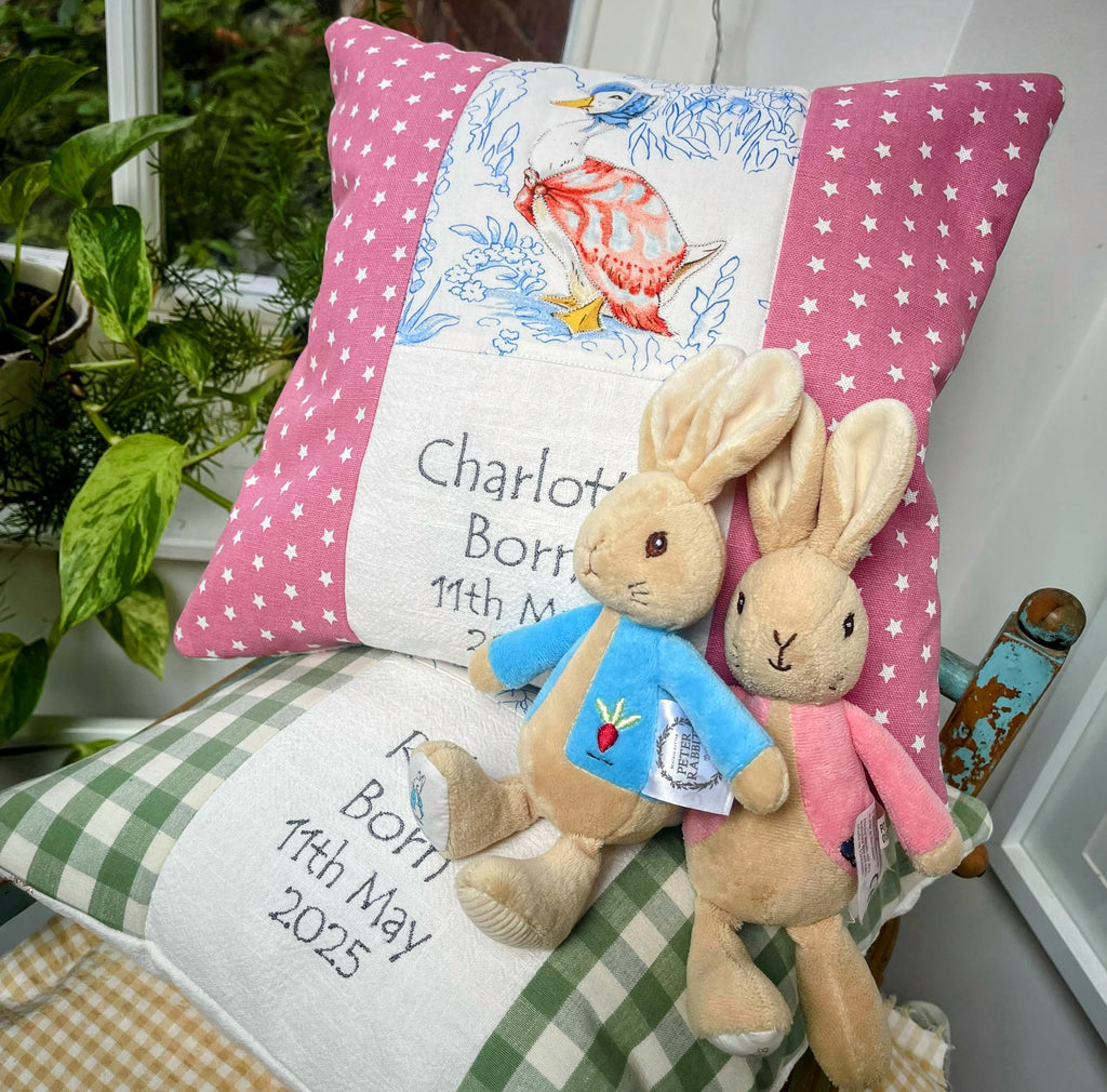 This beautiful cushion is available with rose pink stars or sage green gingham, and features a Beatrix Potter character in the middle patch, and is embroidered with your child’s name and date of Christening.