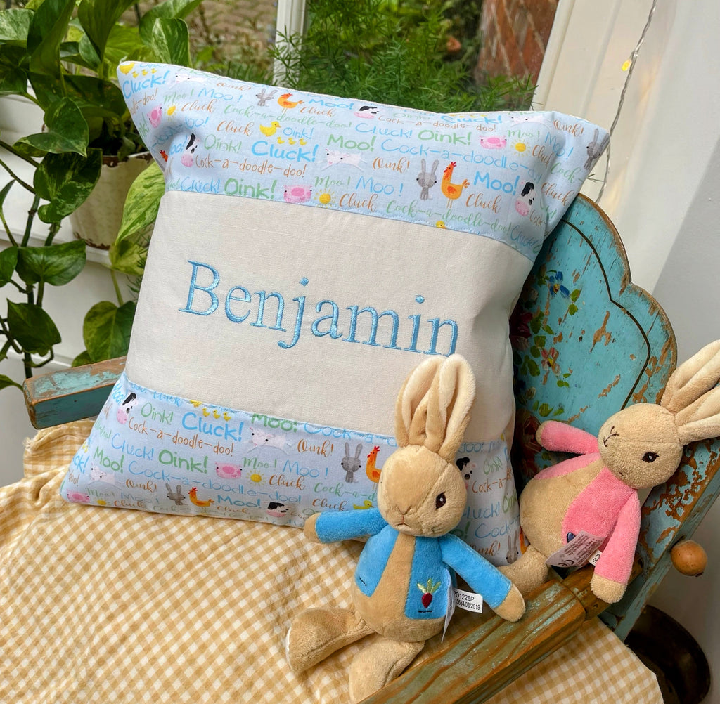 This beautiful cushion features tiny farmyard animals in a sunny sunshine yellow fabric and is embroidered with your child’s name and date of birth in the centre panel.