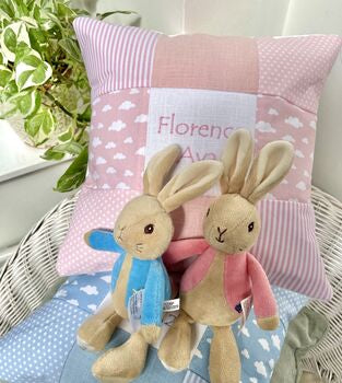 Why not add an adorable soft toy? Choose from Peter Rabbit or Flopsy Bunny. We can embroider up to three names on the cushion or two names and a date.