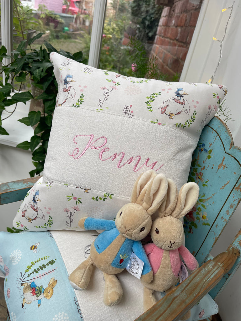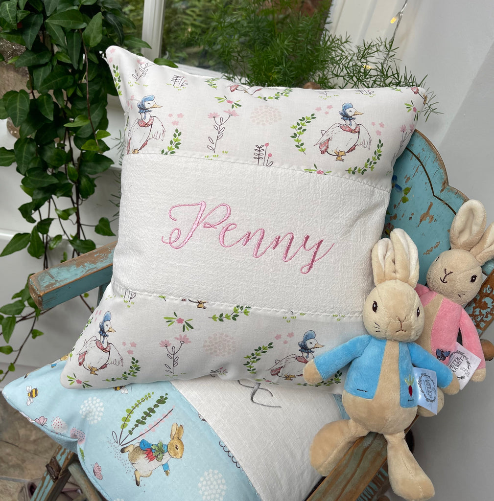 This beautiful cushion is made with a top and bottom strip of Peter Rabbit or Jemima Puddleduck fabric, with a centre strip featuring the name and optional date.