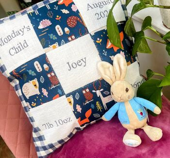 This beautiful woodland themed cushion comes from our best selling memory cushion* range. This cushion comes embroidered with the birth details of your new born baby such as name, date, weight etc.