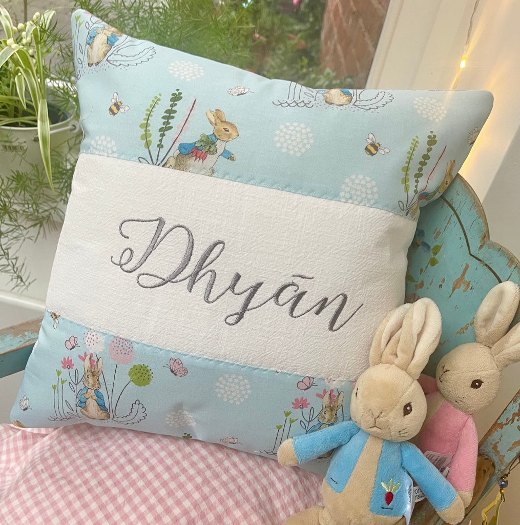 This beautiful cushion is made with a top and bottom strip of Peter Rabbit or Jemima Puddleduck fabric, with a centre strip featuring the name and optional date.
