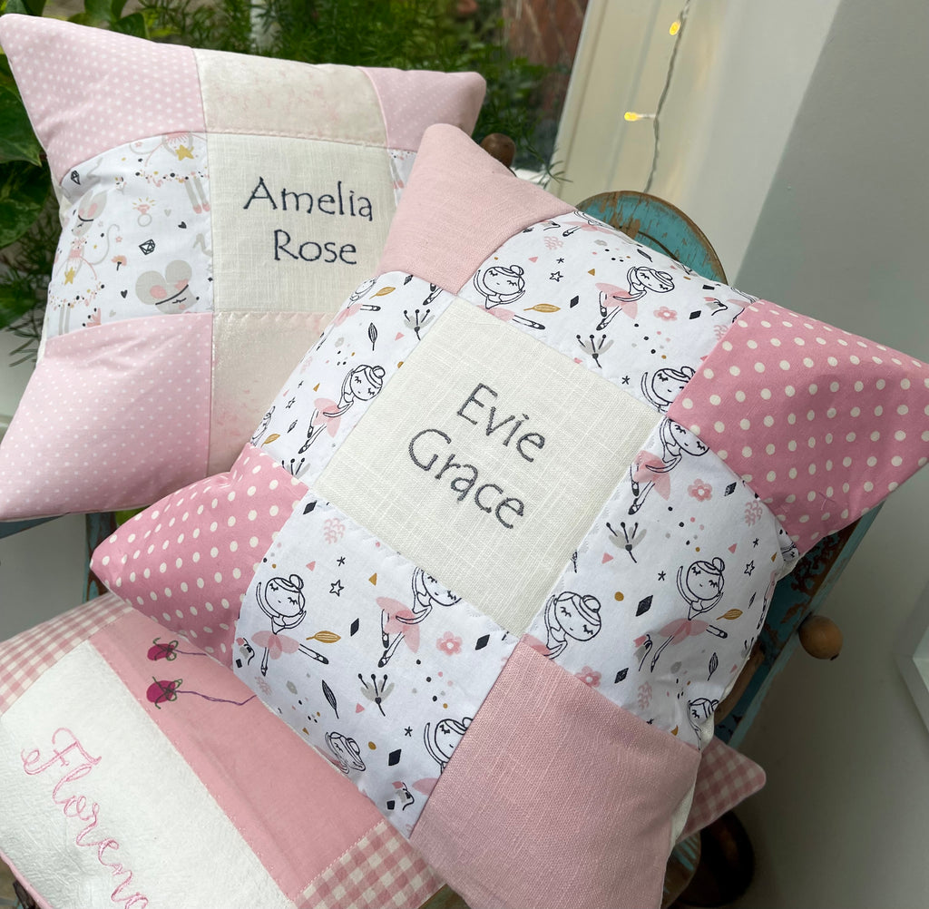 This adorable cushion features a cute ballerina print with simple pink patterned patches and is embroidered with your child’s name and a special date of your choice in grey thread.