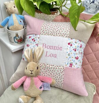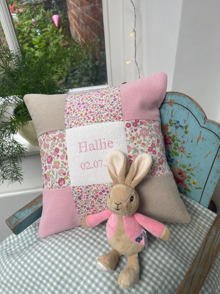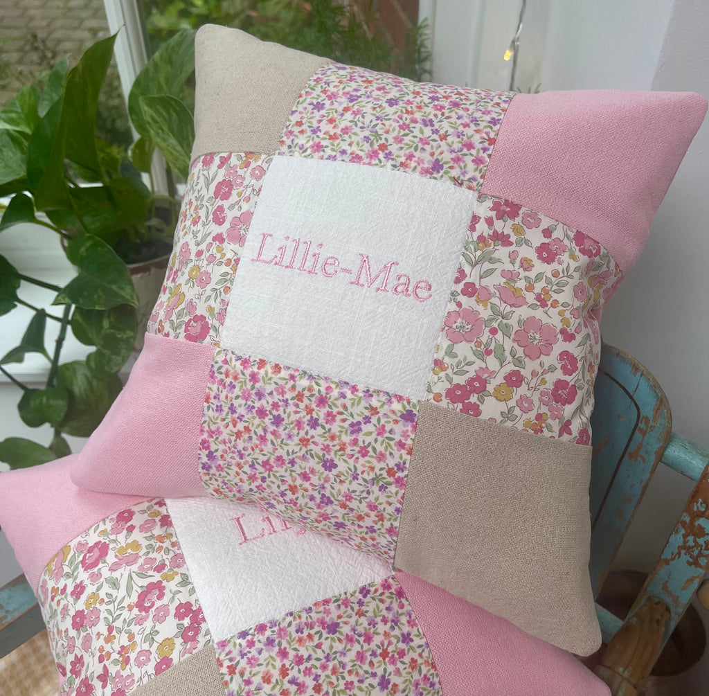 This lovely patchwork name cushion is embroidered with up to three names. It is handmade from gorgeous floral prints and contrasting pink and natural patches.