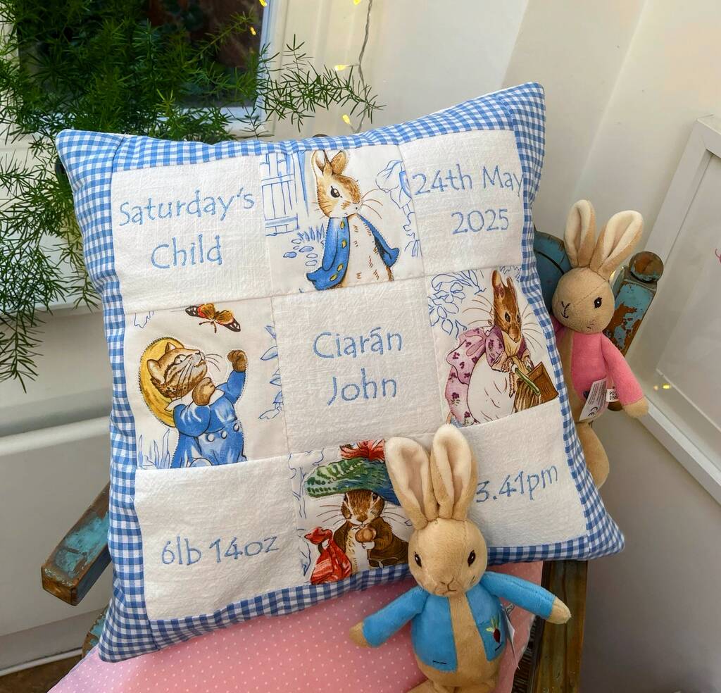 This gorgeous handmade cushion features four adorable Beatrix Potter© characters. Embroidered with names and birth details, this is an amazing keepsake for a newborn baby and will look wonderful in any child's nursery or bedroom. You can choose either pink or grey embroidery.