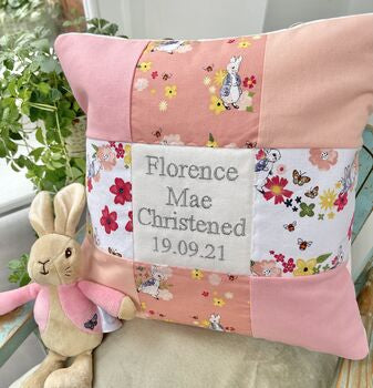 This beautiful patchwork cushion features tiny Peter rabbits and is embroidered with your child’s name and date of Christening, Baptism, naming day or birthday and would look lovely in any nursery or child’s bedroom.