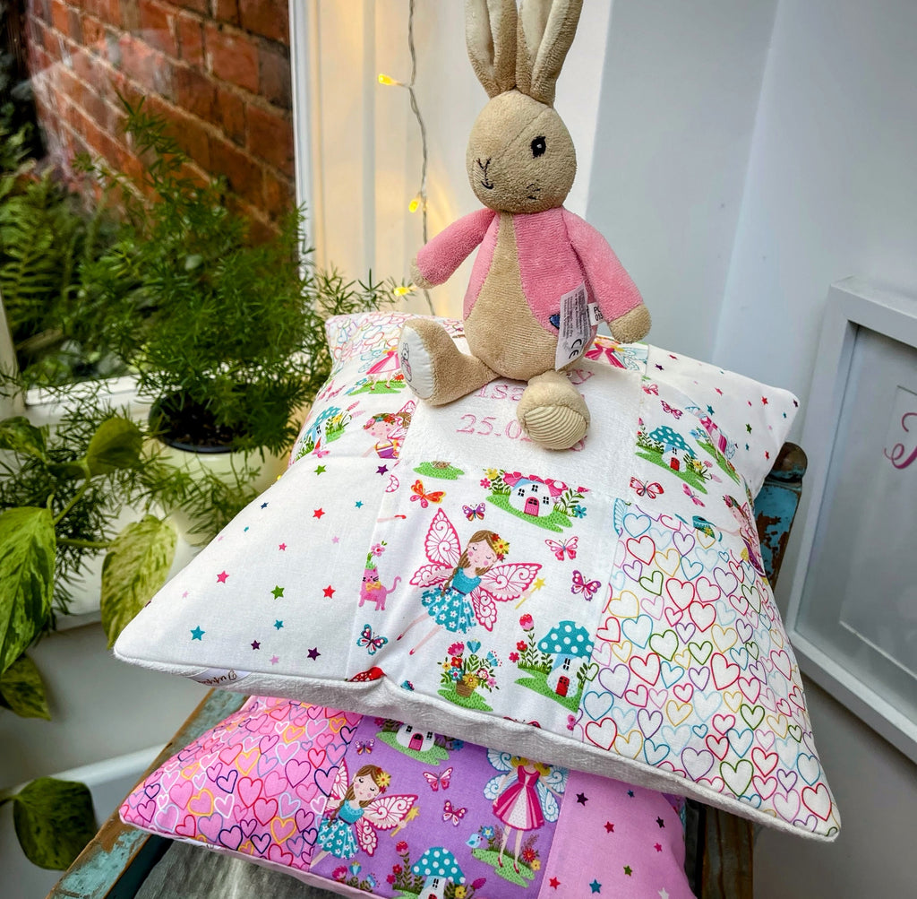 You may like to add a little Rag doll or Flopsy Bunny soft toy, which will come tied to the cushion with a satin ribbon.