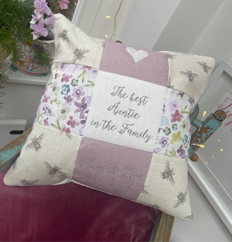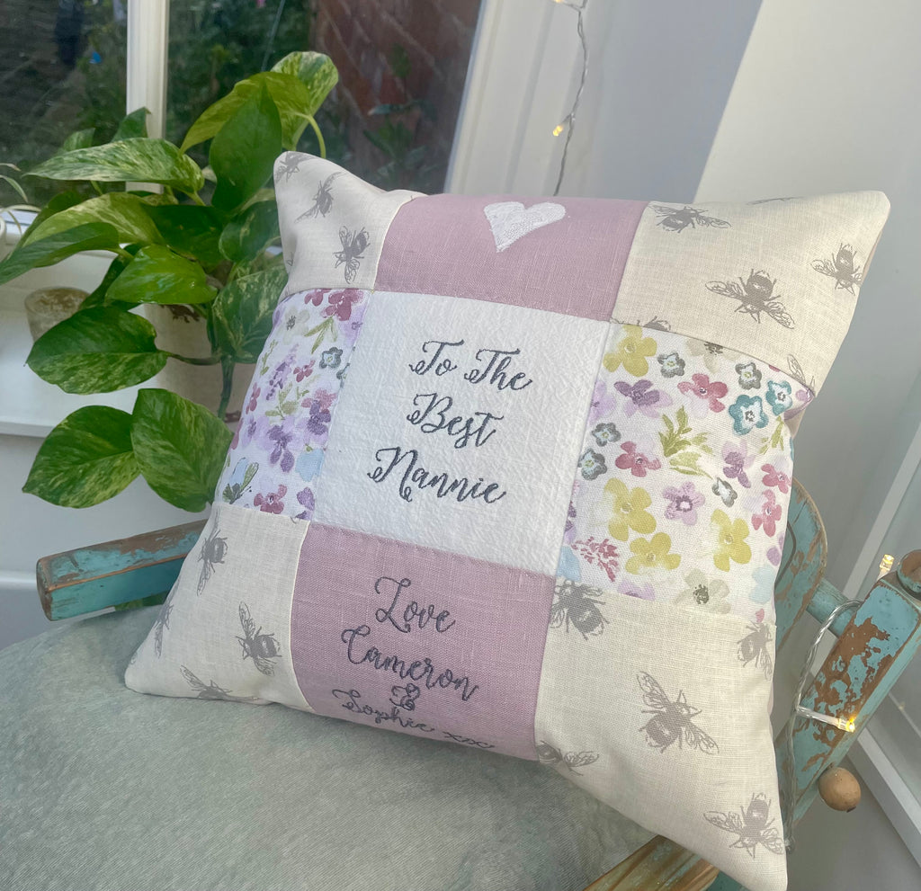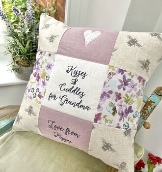 This beautiful watercolour floral with bees and contrasting purple heather linen patchwork cushion is embroidered with the words 'Hugs & Cuddles for Grandma ‘ and a message such as 'Love Emily....'