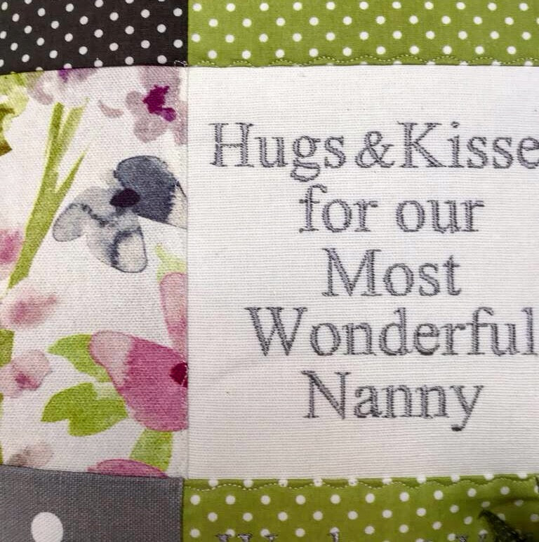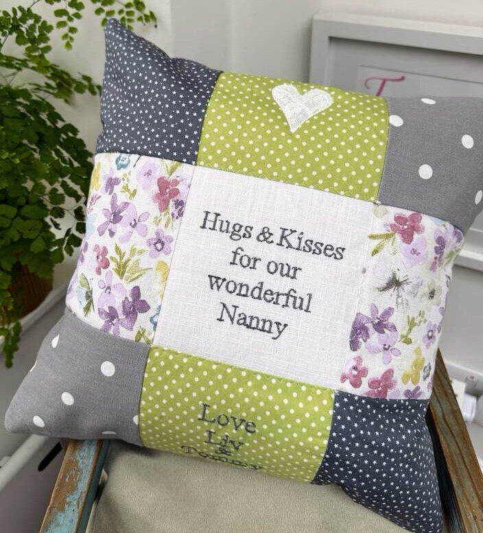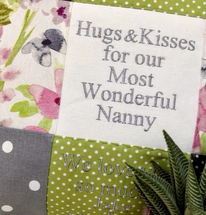 This cushion is made from a selection of sage green and greyfabrics to sit in any room in the house. The centre patch is embroidered with the saying 'Hugs and kisses for the most wonderful Nanny' or another saying of your choice. Sign your gift off with love by adding your name(s) to it on the bottom.