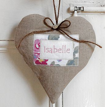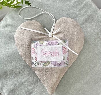 This gorgeous linen heart is embroidered with a name of your choice onto silk, which is then laid onto a beautiful vintage print cotton. The heart is trimmed with a ribbon bow and is filled with French lavender.