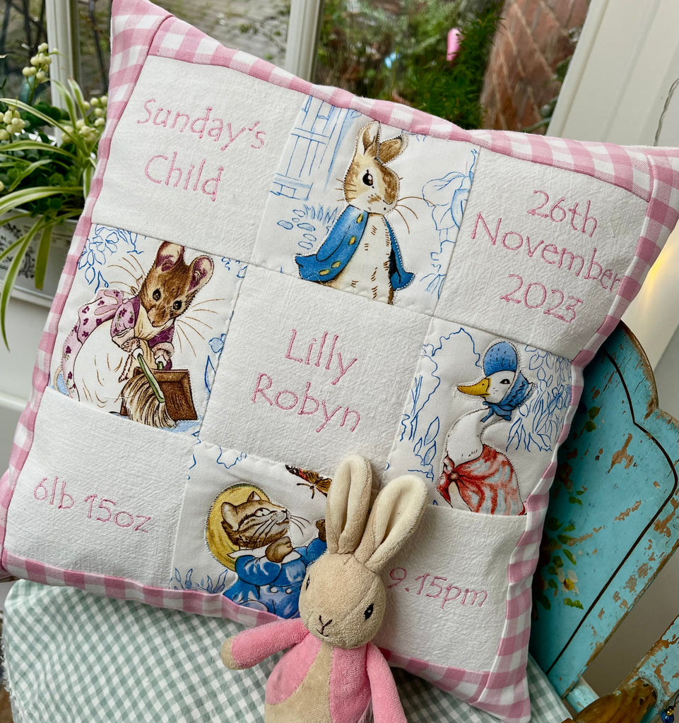 This gorgeous handmade cushion features four adorable Beatrix Potter© characters. Embroidered with names and birth details, this is an amazing keepsake for a newborn baby and will look wonderful in any child's nursery or bedroom. You can choose either pink or grey embroidery.