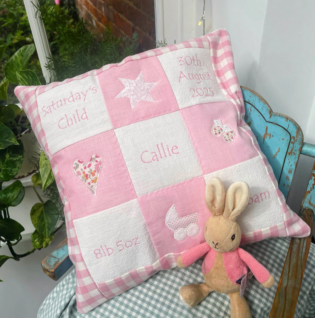 Each cushion is carefully embroidered with the name of the baby, day, date, time of birth together with baby's birth weight and appliqued with boats, a train and a star for boys and a heart, a pram, booties and a star for a girls.