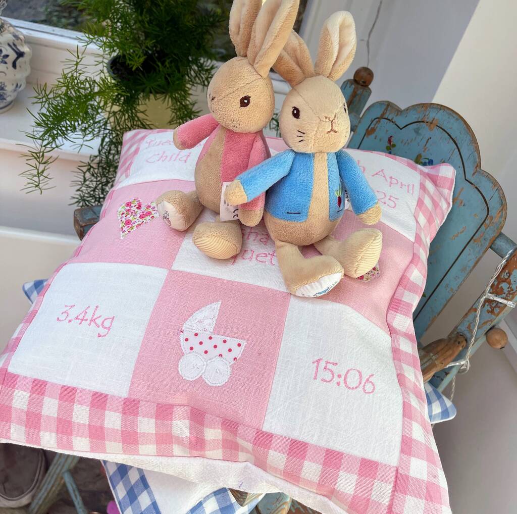 Our individually handmade appliqued Memory Cushion* is embroidered with names and birth details, and comes complete with a removable polyester fibre filled pad.