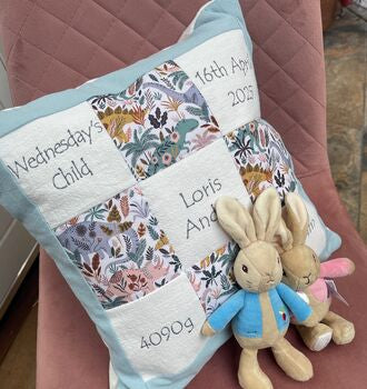 Why not add an adorable Peter Rabbit or Flopsy Bunny rattle toy to make a gorgeous gift set! The little character comes tied to the personalised cushion in a big satin bow.