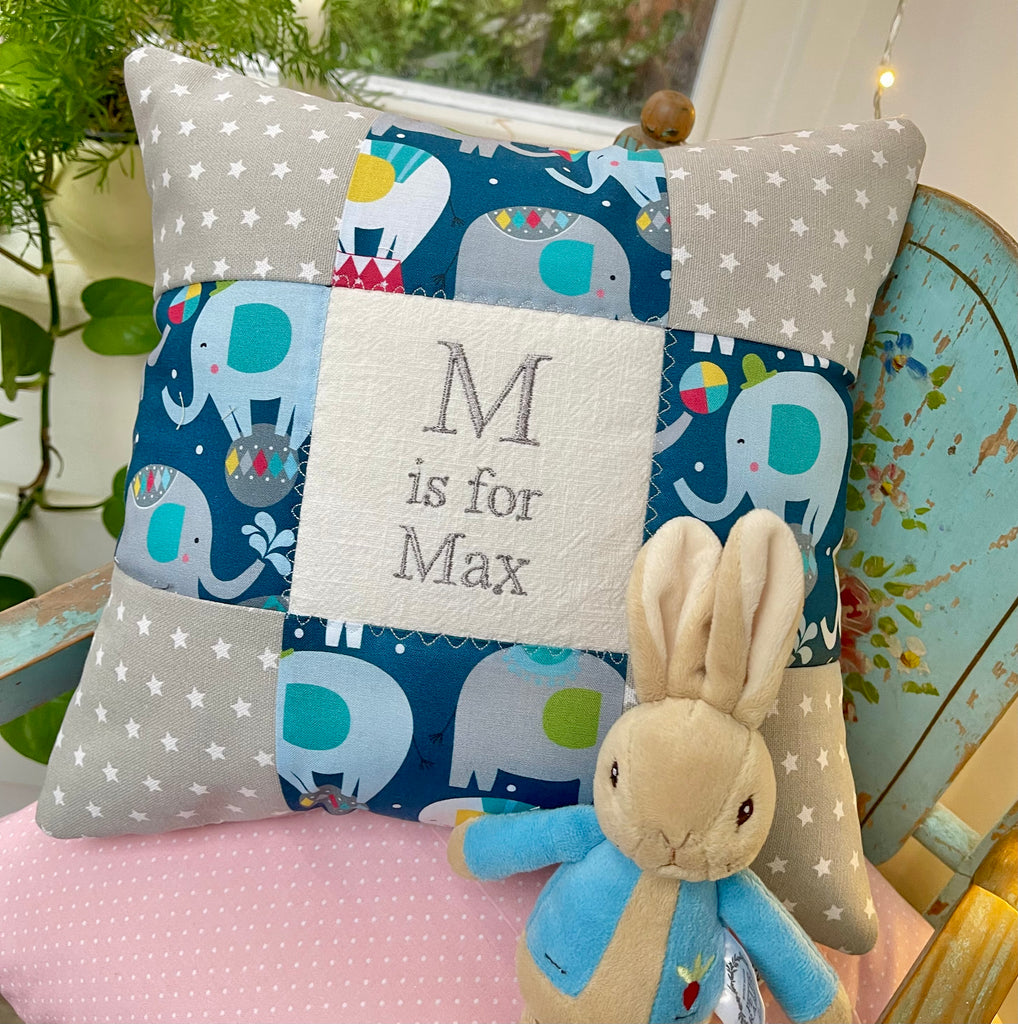 This really cute cushion features patchwork elephants, and is embroidered with the initial and name of your child. Choose from blue or pink elephants.