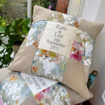 Made from a selection of patches, including a beautiful watercolour floral print. The centre patch is embroidered with the couples names and special date and the linen patches are appliqued with Nottingham Cluny lace hearts.